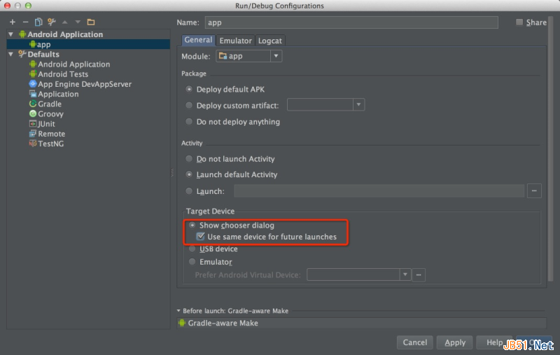 Studio 默認安裝會啟動模擬器,如果想讓安裝到真機上可以配置一下。在下拉菜單中選擇 Edit Configurations 選擇提示或者是USB設備。