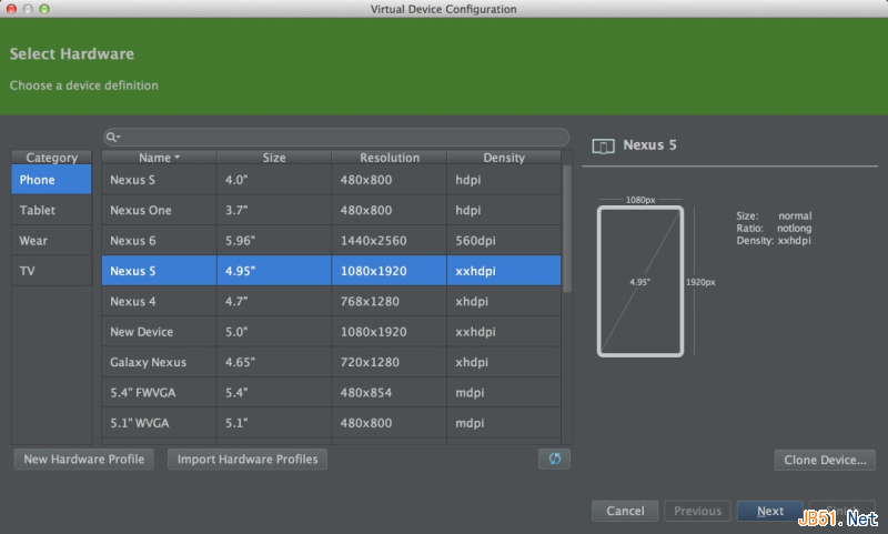 選擇一個設備,這裡我選擇 Nexus 5,然後Next
