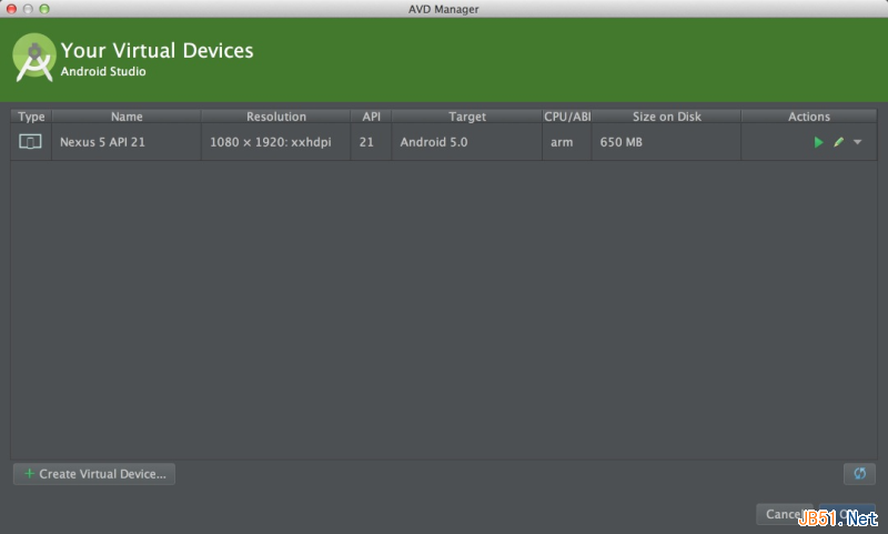 由於各位的屏幕尺寸不一樣,建議這裡Scale一欄選擇Auto,然後點擊Finish接著可以看到我們已經創建好一個5.0的模擬器了