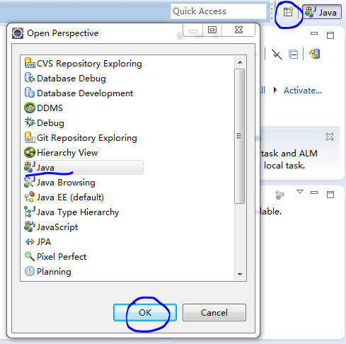 我們先切換透視圖到JAVA,找到右上角的透視圖按鈕,在彈出的窗口中選擇Java,確定。