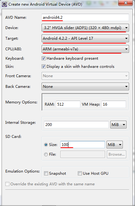 點New,我們來新建一個設備:SD卡會在系統裡生成一個同等大小的文件,用來模擬SD卡,因此不宜設置得太大。