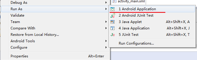 或在HelloWorld上點右鍵,Run As->Android Application: