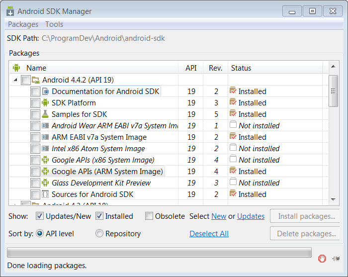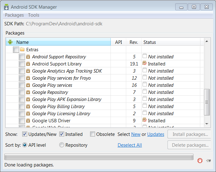 然後執行Android SDK Manager 選擇你已經下載的包進行安裝即可。