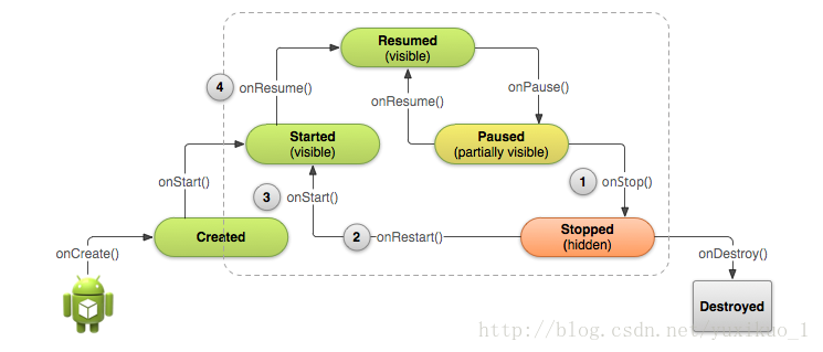 停止狀態UI不可見。系統在Activity停止時會在內存中保存了Activity實例,有時不需事先onStop(),onRestart()甚至onStart()方法,因為大多數的activity相對簡單,activity會自己停止與重啟。你只需要使用onPause來停止正在運行的動作,並斷開系統資源鏈接。