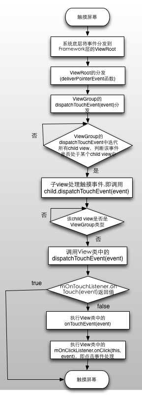 用戶觸摸屏幕產生一個觸摸消息,系統底層將該消息轉發給ViewRoot ( ViewRootImpl ),ViewRoot產生一個DISPATCHE_POINTER的消息,並且在handleMessage中處理該消息,最終會通過deliverPointerEvent(MotionEvent event)來處理該消息。在該函數中會調用mView.dispatchTouchEvent(event)來分發消息,該mView是一個ViewGroup類型,因此是ViewGroup的dispatchTouchEvent(event),在該函數中會遍歷所有的child view,找到該事件的觸發的左邊與每個child view的坐標進行對比,如果觸摸的坐標在該child view的范圍內,則由該child view進行處理。如果該child view是ViewGroup類型,則繼續上一步的查找過程;否則執行View中的dispatchTouchEvent(event)函數。在View的dispatchTouchEvent(event)中首先判斷該控件是否enale以及mOnTouchListent是否為空,如果mOnTouchListener不為空則執行mOnTouchListener.onTouch(event)方法,如果該方法返回false則再執行View中的onTouchEvent(event)方法,並且在該方法中執行mOnClickListener.onClick(this, event) ;方法; 如果mOnTouchListener.onTouch(event)返回true則不會執行onTouchEvent方法,因此點擊事件也不會被執行。