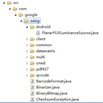 本文使用了ZXing1.6的core,即把/zxing-1.6/core/下的src復制覆蓋工程的src;另外還要使用到/zxing-1.6/android/下的PlanarYUVLuminanceSource.java。