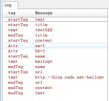 <?xml version="1.0" encoding="utf-8"?> <test> <title>testSAX</title> <content aa="1" bb="2"> <name>hellogv</name> <url>http://blog.csdn.net/hellogv</url> </content> </test>