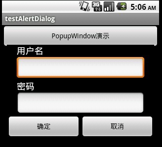 下圖所示是PopupWindow彈出的截圖,這裡的PopupWindow是個登錄框,點“確定”則自動填寫,點“取消”則關閉PopupWindow。