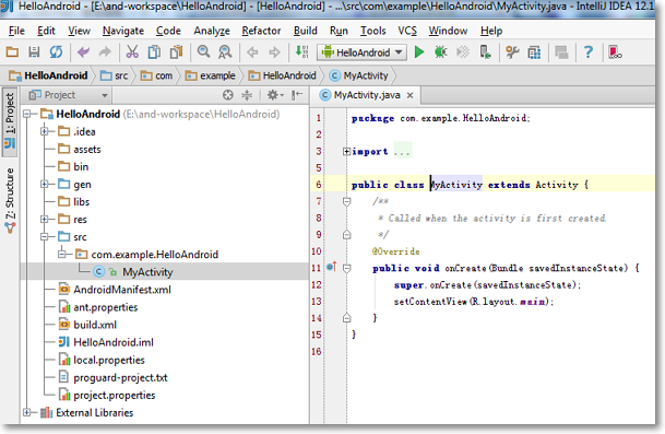 打開IDEA之後並綁定Android SDK,我們就可以使用其開發Android程序了,如下: