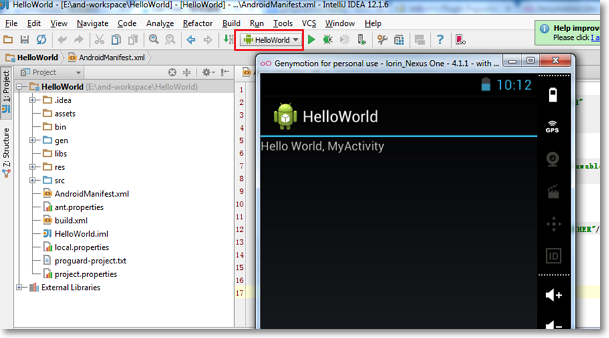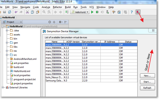打開Intellij,並確保Genymotion的插件安裝正確,下圖的上方的紅色剪頭即為Genymotion的插件按鈕,通過點擊這個按鈕,我們需要創建Android virtual device,我已經創建了多個,在此我選擇lorin_Nexus開頭的,並啟動它。