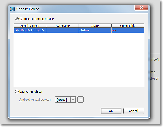 接著我們可以創建一個Android工程,並將該工程置於Android開發狀態,最後一張圖的紅色框住的部分,默認為測試狀態,然後點擊紅色框框的運行按鈕,即會調出下方的Choose Device窗口,這就是我在強調的最重要的一項是Target Device一定要選擇Show device chooser 的dialog原因。