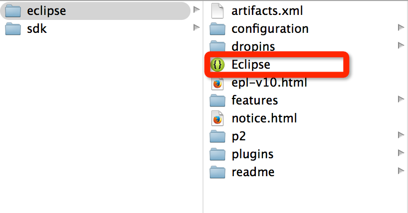 解壓開發工具包後可看到底下有兩個文件夾:eclipse和sdk。其中eclipse這個目錄裡有我們編程用的集成開發環境,而sdk這個目錄裡放的是和 android 開發相關的資源,具體到裡面每個目錄做什麼,這裡我就先不詳細展開。