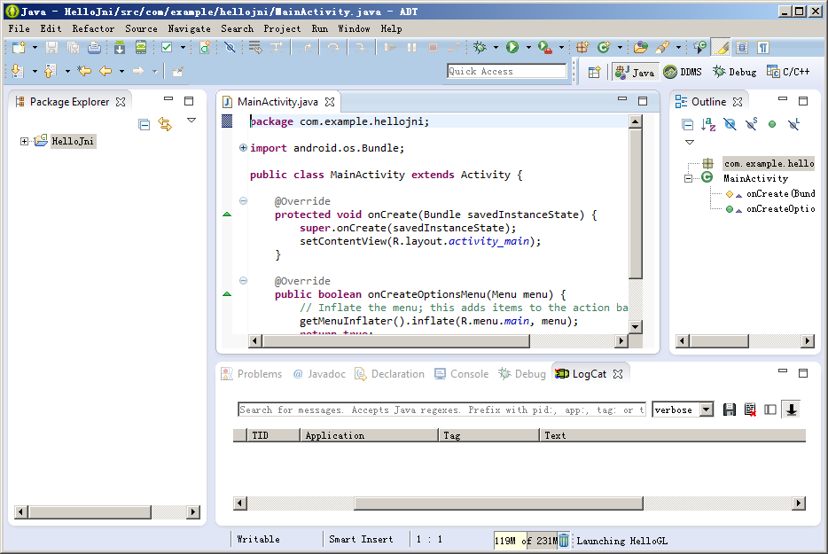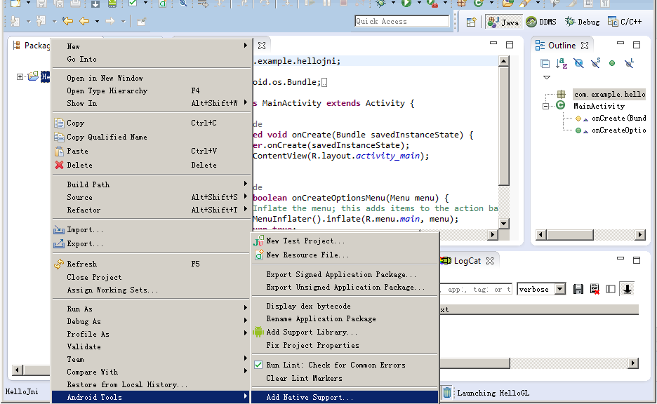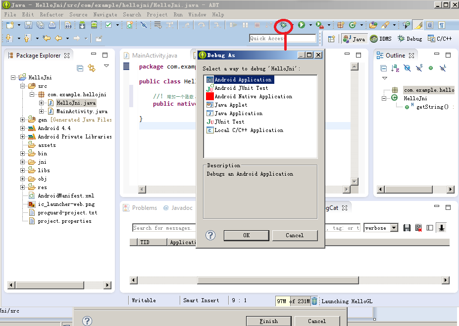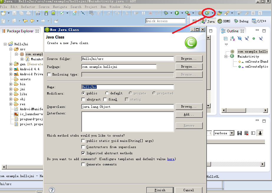 完成以後。可以看代碼,生成一個HelloJni的.cpp文件。