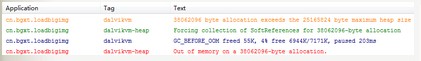先來分析一下這個錯誤,首先dalvikvm(Android虛擬機)發現需要的內存38MB大於應用的堆內存24MB,這個時候嘗試使用軟加載的方式加載數據,我們知道當內存不足的時候dalvikvm會自動進行GC(Garbage Collection),大概清理了55k的空間出來,耗時203毫秒,但是內存還是不夠,所以最後發生堆內存溢出的錯誤。