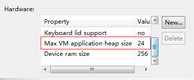 Android系統主要用於低能耗的移動設備,所以對內存的管理有很多限制,一個應用程序,Android系統缺省會為其分配最大16MB(某些機型是24MB)的空間作為堆內存空間,我這裡使用的模擬器調試的,這個模擬器被設定為24MB,可以在Android Virtual Device Manager中查看到。