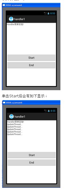這個例子比剛才那個例子稍微復雜些。因為這個例子中用到了handler的消息隊列機制,即通過handler中一個線程向消息隊列中用sendMessage方法發送消息,發送的消息當然可以用來傳遞參數。在handler中用handleMessage來處理消息,處理方法是獲得消息隊列中的消息參數,用這些參數來完成另外一些功能。
