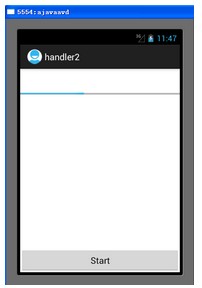 本實驗實現的是當開始按鈕按下時,會啟動一個線程,並綁定到handler中,該線程發送帶有參數的message到handler的消息隊列中,消息隊列的另一端獲取該消息,並且用該消息的參數來更新進度條。
