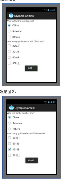 上面3個為一組RadioGroup,每選中其中一個RadioButton,則會有相應的提示。且只能選中其中的一個。