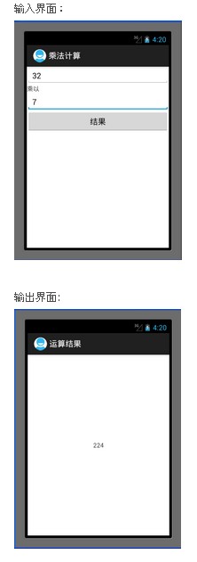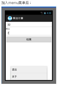在第一個界面中的2個乘數輸入處分別輸入2個數字,按下結果button,會自動跳到第二個界面並顯示輸入2個數字相乘的結果。如果在第一個界面中點擊系統的menu按鈕,則會自動彈出一個菜單,菜單欄包括退出和關於2個按鈕,點擊退出按鈕,則退出了該程序。