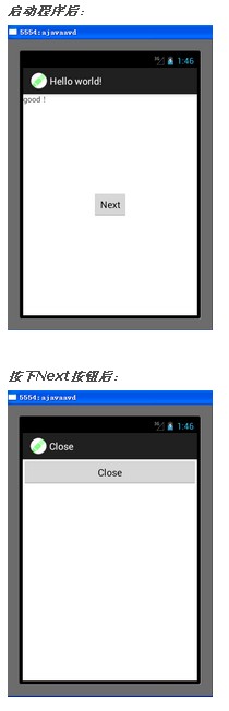 在第一個Hello World!為標簽的activity中顯示good,該界面中有一個名為Next的按鈕。點擊Next按鈕進入到第二個activity中去,第二個界面中只有1個Close按鈕。當然,據網上有人將要比較安全的實現關閉程序的功能也不是挺簡單的,因為android有專門的退出鍵返回鍵等。所以該Close按鈕暫時沒去實現它。