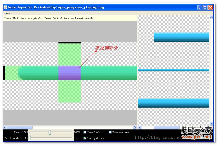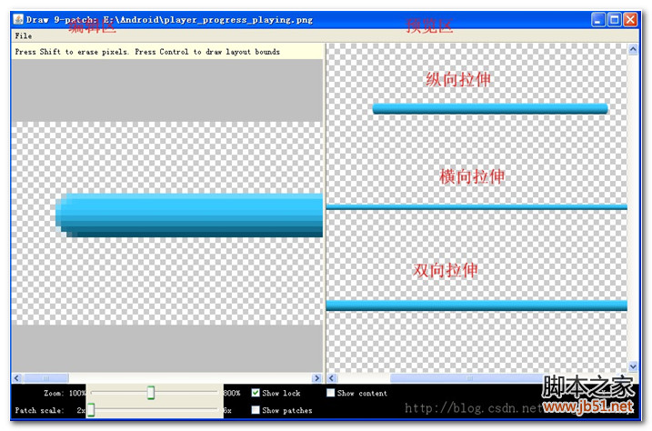 .9.png格式在Andriod中可以做到根據控件大小自適應,最重要的是不會失真。是不是很完美?下面就來看是如何制作.9.png格式的進度條。