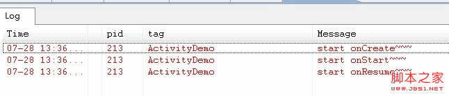 核心在Logcat視窗裡,如果你還不會用Logcat你可以看一下我的這篇文章Android開發筆記之:Log圖文詳解(Log.v,Log.d,Log.i,Log.w,Log.e),我們打開應用時先後執行了onCreate()->onStart()->onResume三個方法,看一下LogCat視窗如下: