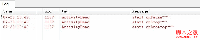當我們按BACK鍵時,我們這個應用程序將結束,這時候我們將先後調用onPause()->onStop()->onDestory()三個方法,如下圖所示:
