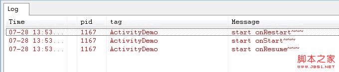 而當我們再次啟動ActivityDemo應用程序時,則先後分別執行了onRestart()->onStart()->onResume()三個方法,如下圖所示: