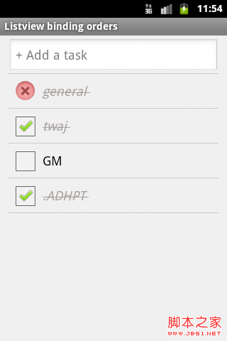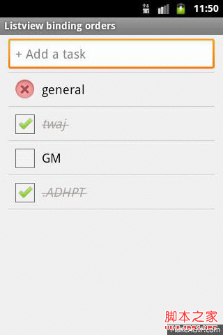 一個典型的ListView,每個Item顯示一個TextView,代表一個Task,需要實現二個編輯方式:一個是用CheckBox來標識任務已經完成,另一個要實現的編輯是刪除任務。對於完成的CheckBox就直接放在布局中就可,但對於刪除不想使用ContextMenu來實現編輯,對於像iOS中那樣的列表,它的刪除都是通過對列表中每個項目的手勢來觸發。這個實現起來並不難,可以用一個ViewSwitcher,Checkbox和刪除按扭是放入其中,讓ViewSwitcher來控制顯示哪一個,正常情況下顯示Checkbox,隱藏刪除按扭,然後當點擊Item時就顯示刪除按扭,隱藏Checkbox,這樣也更符合操作習慣,可以一個一個條目的刪除。