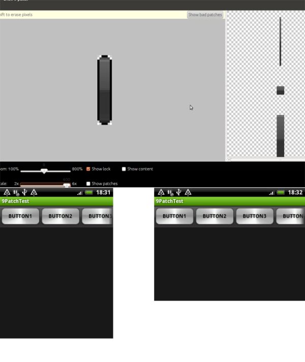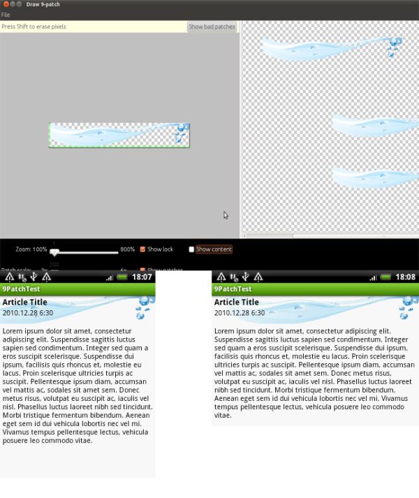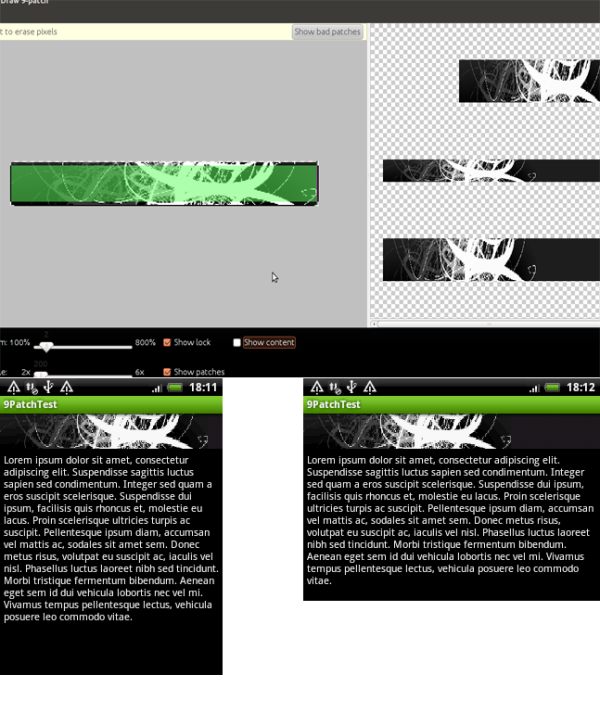 對於初學Draw9Patch的人來說,這可以算是高級技巧,那就是:拉伸區域,可以不是連續的,可以不止一塊,而且是和自定義的邊框線的長度成正比。