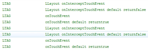 結論:LLayout中onInterceptTouchEvent返回了true,對觸摸事件進行了攔截,所以沒有將事件傳遞給View,而直接執行了LLayout中的onTouchEvent事件;