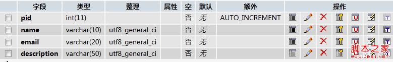 數據庫表結構如下,連接數據庫代碼就不貼出了,記得把編碼設置為UTF-8就行了。