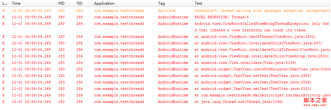 們打開LogCat窗口,出錯日志信息如圖所示。