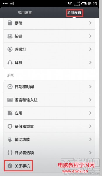 2.然後在設置界面中,切換至“全部設置”選項卡,點擊“關於手機”項。