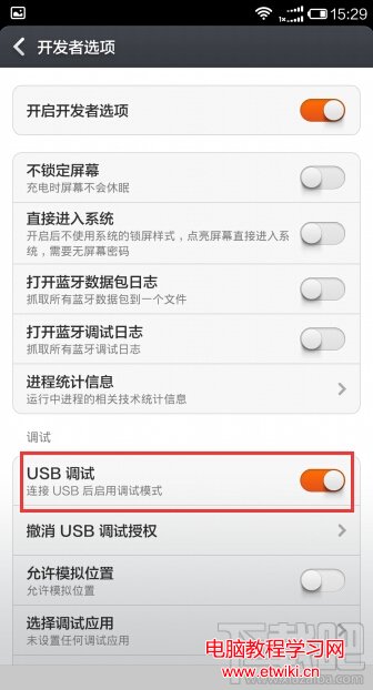5.在“開發者選項”界面中,勾選開啟“開發者模式”,同時勾選打開“USB調試”項。