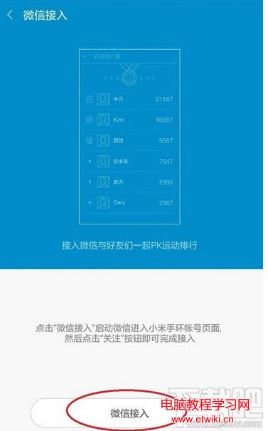 接下來會跳轉到微信應用,並顯示“小米手環”的微信號,點擊“關注”按鈕繼續。