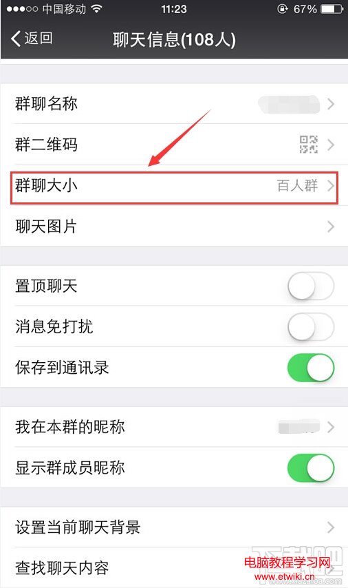 3.進入群設置頁面後,把菜單往下拉,找到第三項群聊大小(安卓版和iphone版可能會有區別,群二維碼下面那項就是了)。
