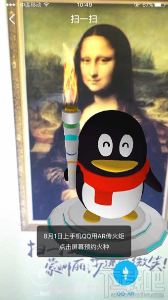 用戶可打開最新版手機QQ點擊“掃一掃-QQ-AR”掃描“蒙娜麗莎”,會出現一只滑翔傘AR企鵝,提示用戶趕緊參與火炬傳遞。
