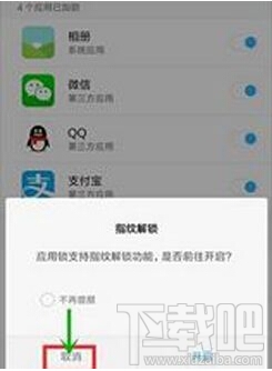也可以點擊:開啟(指紋解鎖),然後把手指放到指紋解鎖裝置上進行驗證指紋,就完成了設置指紋解鎖應用鎖。