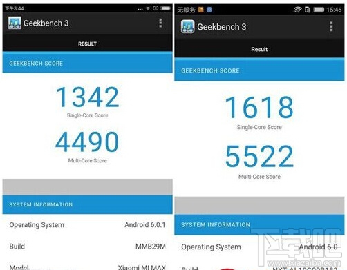 除此之外,在處理器測試軟件GeekBench3的測試中,小米Max得到了1379的單線程成績和4363的多線程成績,同樣均低於華為Mate8的1618分和5522分。