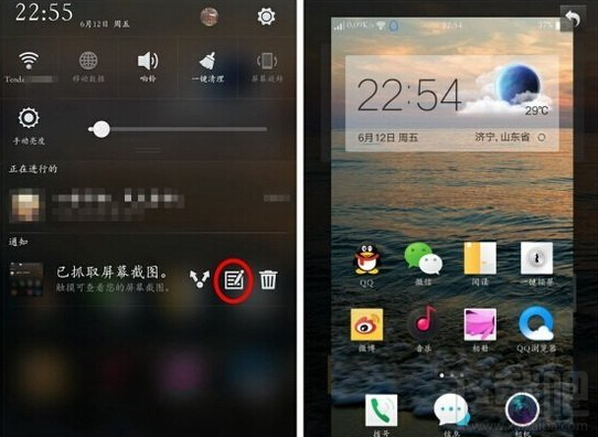 此外,在任意需要截屏的界面截圖後,打開頂部下拉快捷鍵菜單,然後點擊“編輯”圖標,可以對截圖進行調整編輯,相當於處理後的自由截圖,如下圖所示。