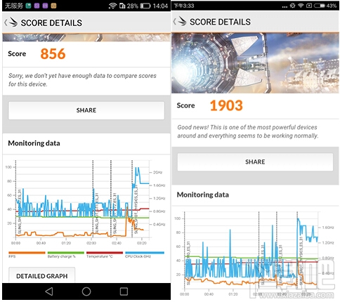 我們使用3DMark來測試處理器GPU圖像處理的表現,以要求最高的Sling Shot ES 3.1為測試項目,最終得出的數值如上圖所示。小米5在Sling Shot中不僅分值非常高,在其中三個測試項目中幀率表現非常不錯。榮耀V8表現平平,Mali-880在Adreno 530面前的確是差了不少。不過從實用的角度來講,目前手游中會用到的3D效果,兩款GPU都能夠毫無壓力的支持。
