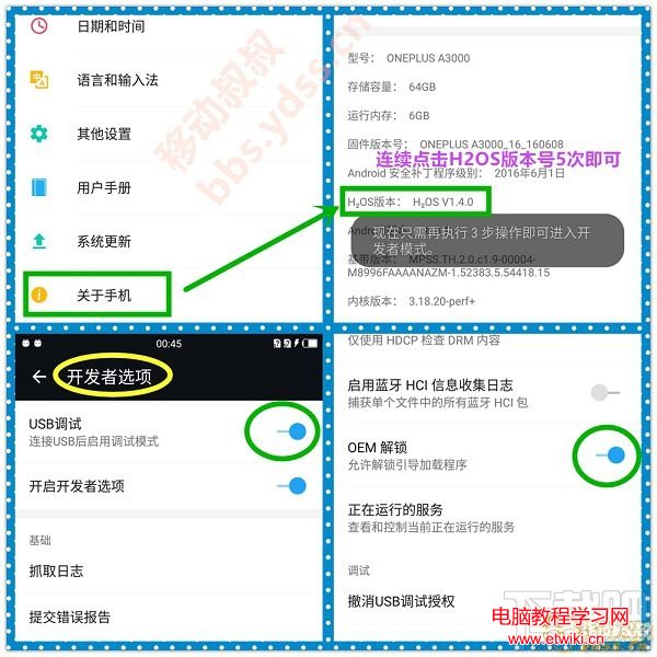 0、進入設置>關於手機,連續點擊版本號那一行,開啟“開發者選項”,將OEM解鎖和USB調試的勾勾打上!具體示意圖如下