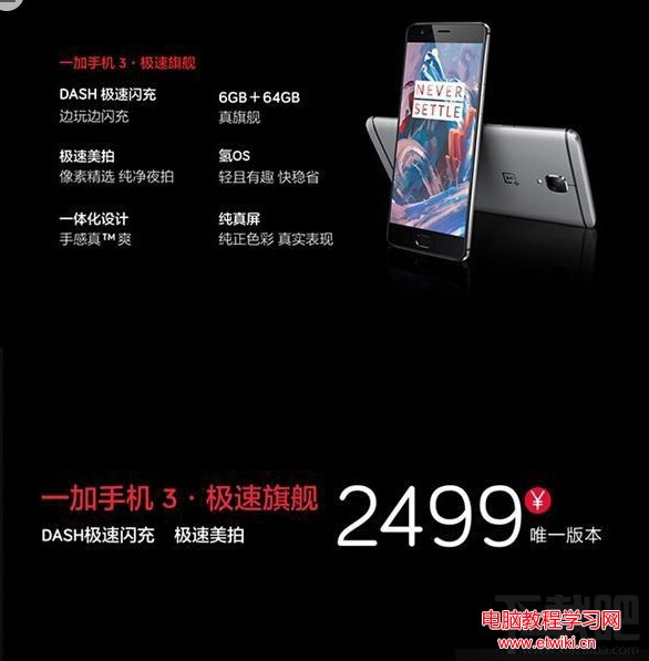一加手機3的最終售價為2499元,有且只有一個版本,沒有所謂的低配版和高配版。