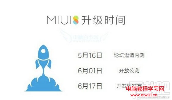 MIUI8升級時間:5月16日邀請內測,6月1日開放公測,6月17日開發版發布,此外的6月底或者7月份會推出正式的穩定版本。