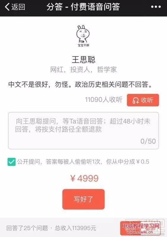 “分答”是什麼?用姬十三的話說,就是“知識零售版在行:“分答”,60s語音付費問答”。在“分答”上,回答者設定自己的價格,限制在1元到500元之間,然後通過對其他人問題的答復得到這筆錢——必須是語音,時間被限制在60秒內;問者和答者共同創造好問題,如果你對別人的問題答案感興趣,選擇“偷聽”也需要付費1元,提問者與回答者都可以得到0.5元,也就是說提問也能賺錢。