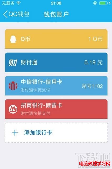 3、在“錢包賬戶裡面”點擊下面的添加銀行卡,就可以添加,只要按照提示添加上銀行卡賬號已經預留手機賬號,然後就會往你手機上面發送驗證碼,確認驗證就可以綁定銀行卡;