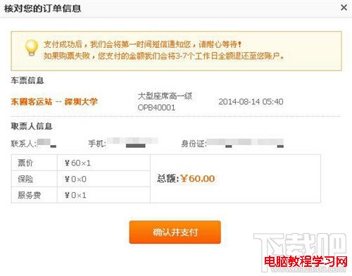 10、付款完你就算是訂票成功了,你的手機就會收到一條信息,憑身份證和訂單號提前一個小時在車站的指定地點就可拿到票了;