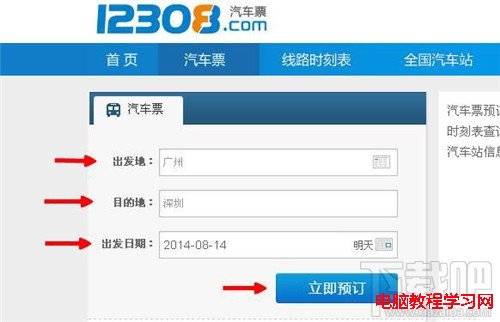 2、在首頁的汽車票欄目框,輸入出發地、目的地、出發時間後點擊【立即預定】;