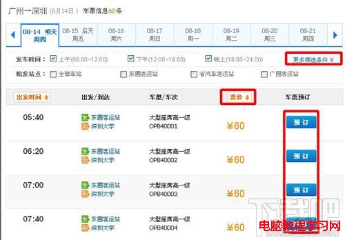3、可以選擇發車時間、票價高低排序、找到合適的後點擊【預定】;